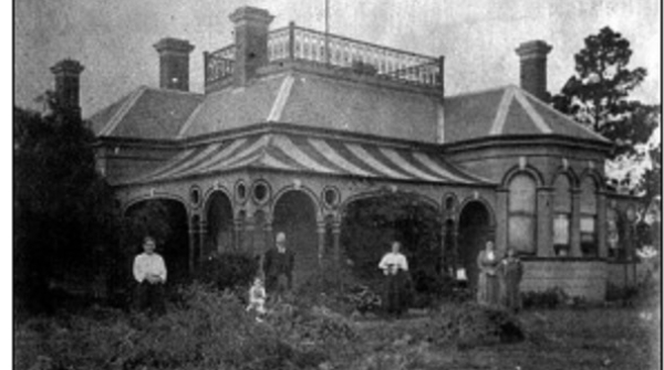Residual large weatherboarded and verandahed house of asymmetrical plan at front comprising projecting rooms. Formerly with cast-iron roof look-out, altered with new roof tiles, stone grotto and other additions. The remnant garden includes stone pines, Monterey cypress, Moreton Bay fig, and sugar gum. The house is now part of a later Roman Catholic complex, having been reused as a presbytery.